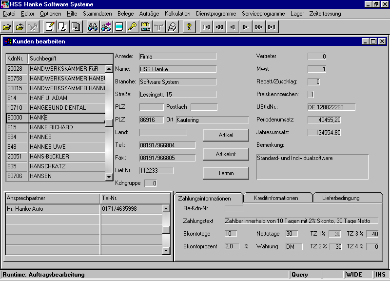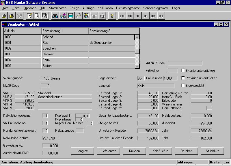 Durch den integrierten Reportgenerator können individuelle Listen vom Anwender selbst generiert werden. Aus sämtlichen Auswahlfenstern ist eine Neuanlage (über den Knopf Stammdaten) von noch nicht erfasster Informationen möglich. Damit können z.B. aus der Faktura heraus fehlende Artikel erfasst oder neue Kunden angelegt werden oder weitere Informationen angezeigt werden.