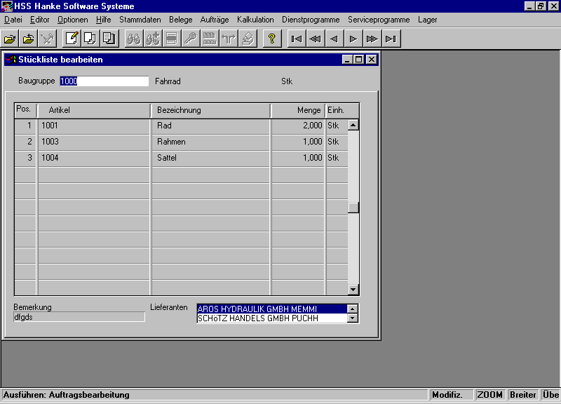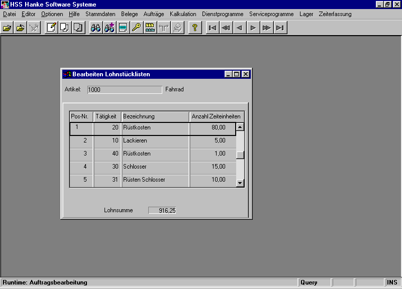 Bearbeitung der Lohnstückliste eines Artikels. Anhand der Daten im